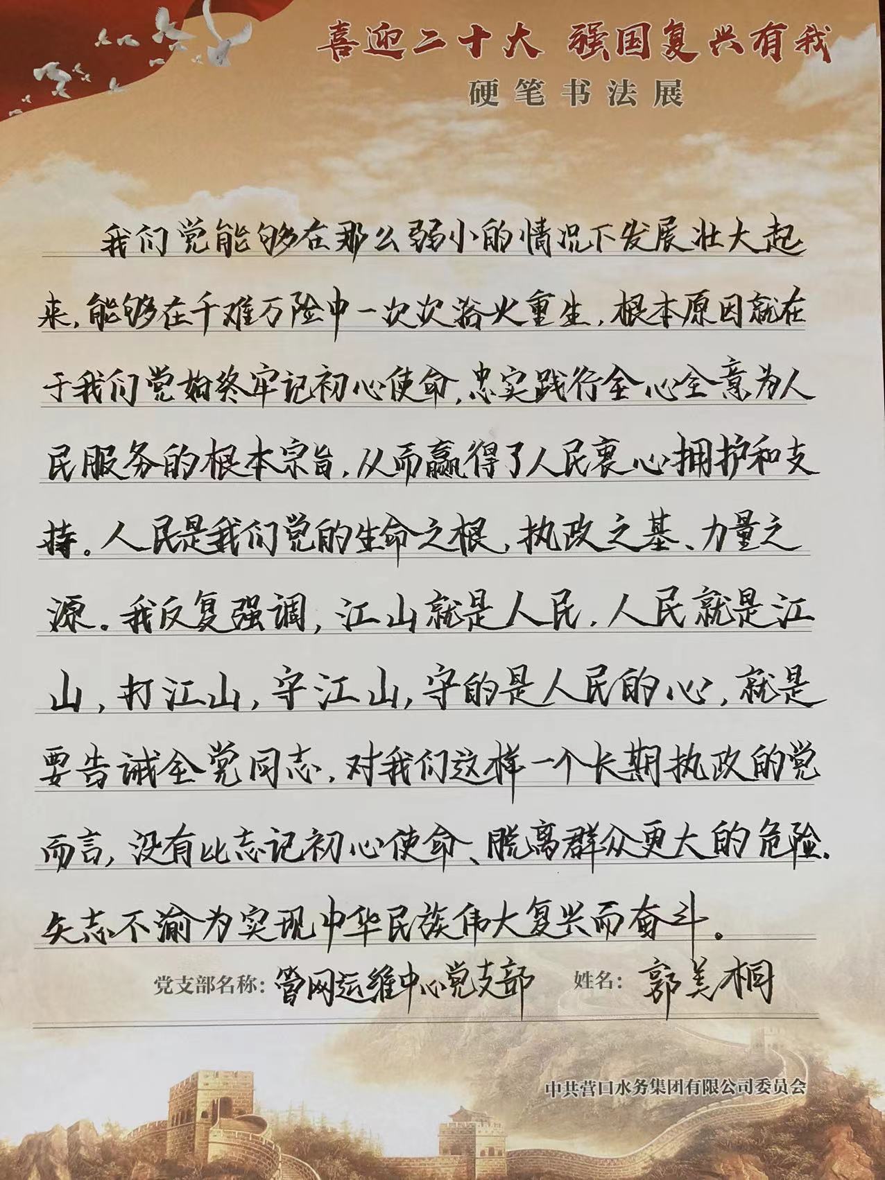 通過此次硬筆書法展,集團(tuán)員工深刻領(lǐng)會《習(xí)近平談治國理政》第四卷的核心要義,在工作中增強(qiáng)“干”的定力、“會”的本領(lǐng)、“實”的作風(fēng),積極推動相關(guān)政策舉措落地生根,真正把學(xué)習(xí)成效體現(xiàn)在供水安全、運(yùn)行效能、優(yōu)化營商環(huán)境的精彩答卷上,以更加主動的精神狀態(tài)、更加昂揚(yáng)的奮斗姿態(tài)迎接黨的二十大勝利召開。