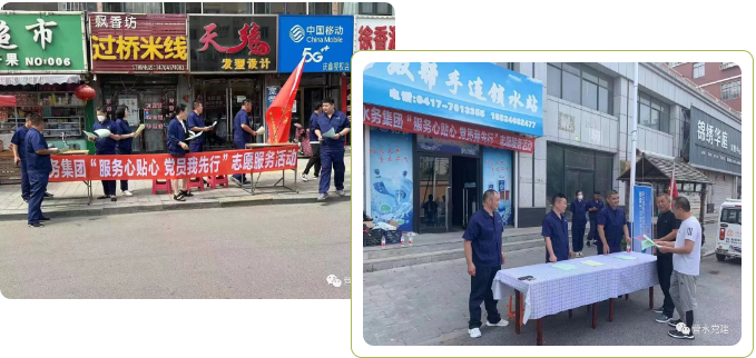集團黨委組織200余名黨員志愿者走進社區(qū)、小區(qū),分別以“黨旗紅 企業(yè)興 水務黨員做先鋒”“水務黨員進社區(qū) 志愿服務暖人心”“服務心貼心 黨員我先行”為主題開展志愿服務活動。通過設立供水便民咨詢臺,向居民介紹用水小常識、耐心地解答居民們日常生活用水問題,進一步拉近與群眾的距離,切實將暖心貼心用心的優(yōu)質供水服務帶進千家萬戶。活動中,共發(fā)放宣傳資料500余張,普及用水知識、解答用戶疑問1000余人次,維修檢查用水設施55戶。