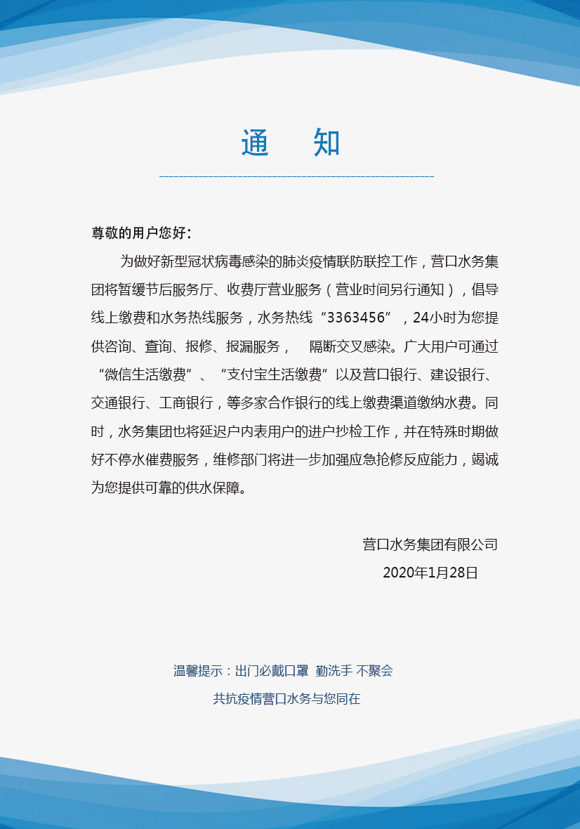 營口水務集團關于暫緩節(jié)后服務廳、收費廳營業(yè)服務的通知
